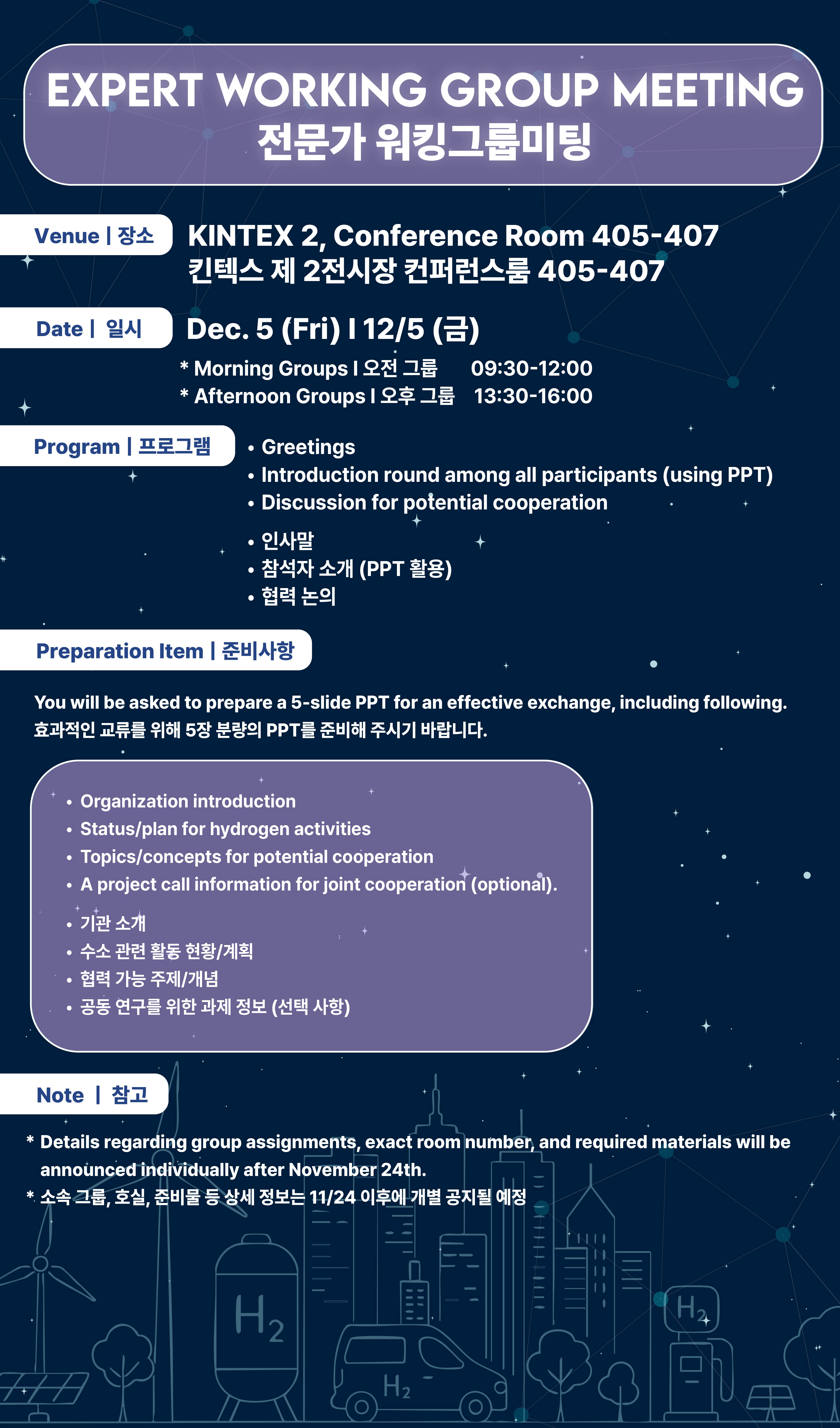 본 컨퍼런스 외에도 수소 전문가 간 워킹그룹 미팅이 별도로 개최될 예정입니다.